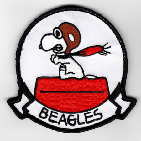 (Another AV8RSTUFF Creation): This is the “BEAGLES” version of the “Black Eagles” squadron patch. Carrier Airborne Early Warning Squadron 113 (VAW-113), known as “Black Eagles”, was established on 20 April 1967 flying the E-2A Hawkeye. Check WIKIPEDIA for a very long and distinguished flying career for the squadron! This patch shows Snoopy on the Sopwith Camel, created for their 2023-2024 deployment, and DOES come with velcro attached.