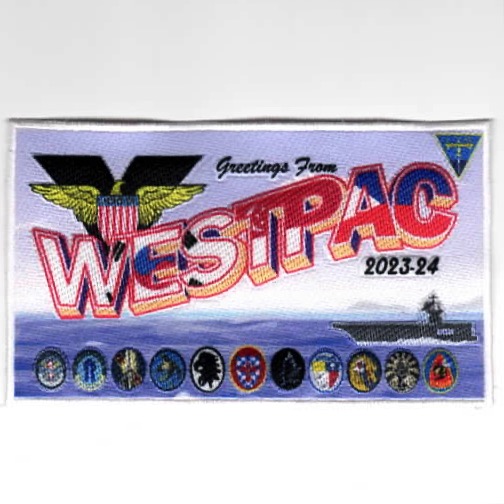 (Another AV8RSTUFF Creation): This is the 2024 cruise patch created by VAW-113 for Carrier Air Wing TWO (CVW-2) onboard the USS Carl Vinson (CVN-70). This patch was created for all of the Air Wing squadrons, to include VFA-2 / VFA-97 / VFA-113 / VFA-192 / VAQ-136 / VAW-113. This is the “large” version, is a very detailed patch, says “GREETINGS FROM WESTPAC / 2023-24”, and DOES come with velcro attached.