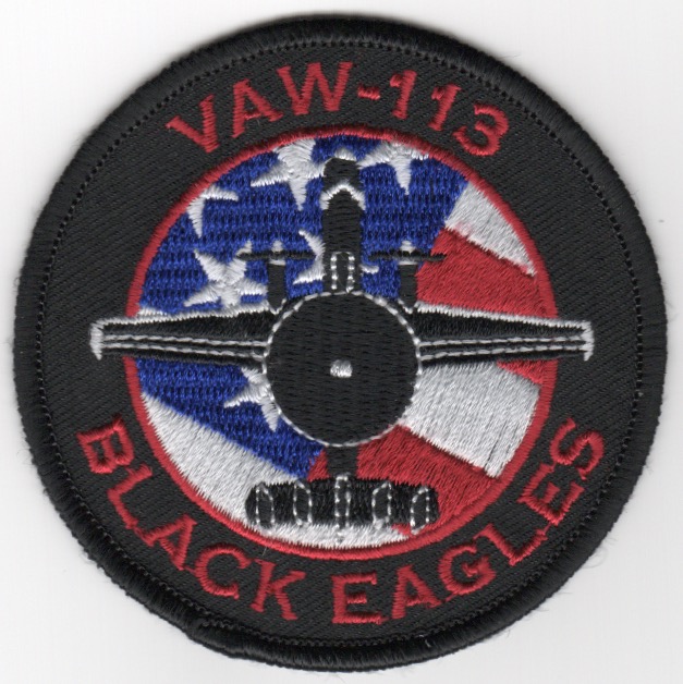 Another AV8RSTUFF Creation: This is the ‘bullet’ patch for the ‘Black Eagles’. It depicts the E-2C Hawkeye planform on a red/white/blue background. This patch does not have velcro attached.