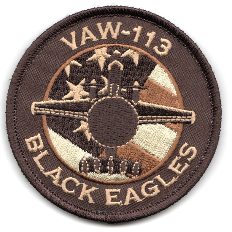 (Another AV8RSTUFF Creation): This is the desert version of the ‘bullet’ patch for the ‘Black Eagles’. It depicts the E-2D Hawkeye planform (note there is NOT that ‘dot’ in the center of the radar dome) on a desert flag background. This patch does have velcro attached.