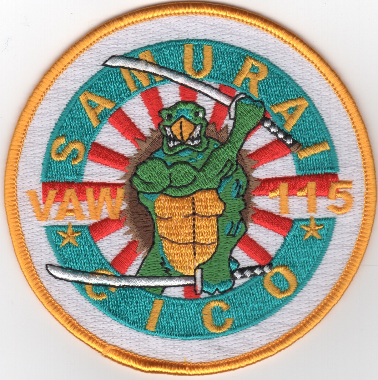 The VAW-115 Liberty Bells are the oldest and only original squadron in Carrier Air Wing FIVE (CVW-5). They joined CVW-5 aboard USS MIDWAY (CV 41) in 1970 and made two combat deployments to the Gulf of Tonkin between May 1971 and April 1973. In September 1973, VAW-115 along with the rest of CVW-5, moved to Yokosuka, Japan, as a component of the U.S. Forward Deployed Naval Forces and established themselves as the only carrier and air wing to be home ported outside the continental United States. Currently, they are relocating to NAS Pt. Mugu, CA to transition into the “D” model. This patch shows a “Ninja Turtle” and says “SAMURAI CICO”, but I don’t know what that signifies……
