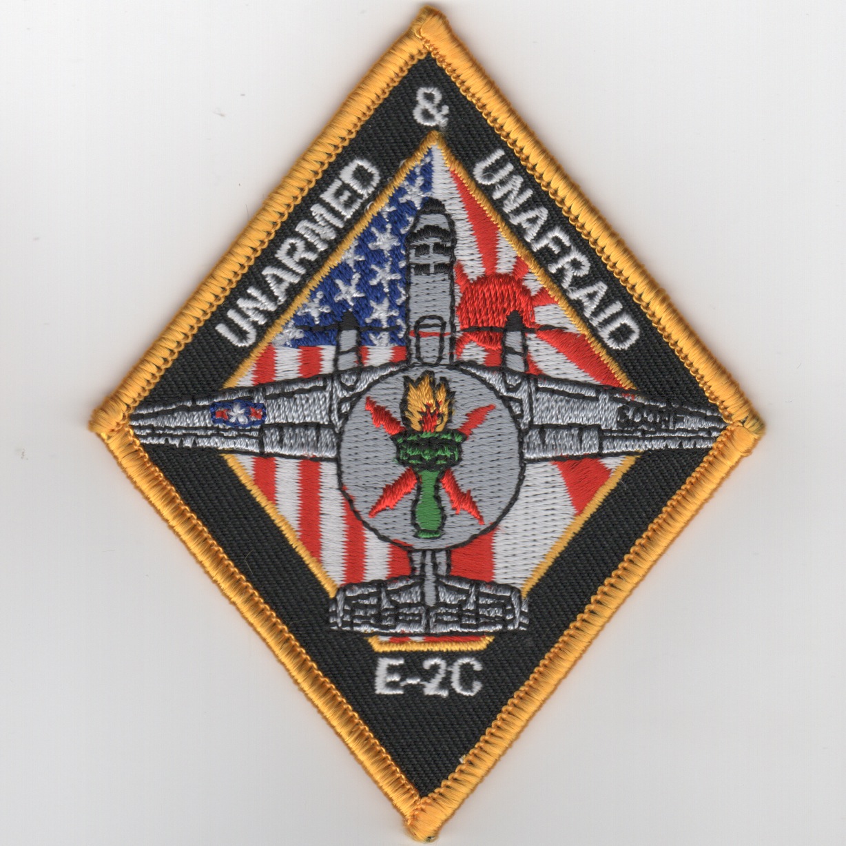 For the squadron’s history, see above (or online). This patch was created for the VAW-115 Liberty Bells and shows the planform of the E-2C. It says “Unarmed and Unafraid” and has the American and Japanese flags in the background with a “diamond” shape.
