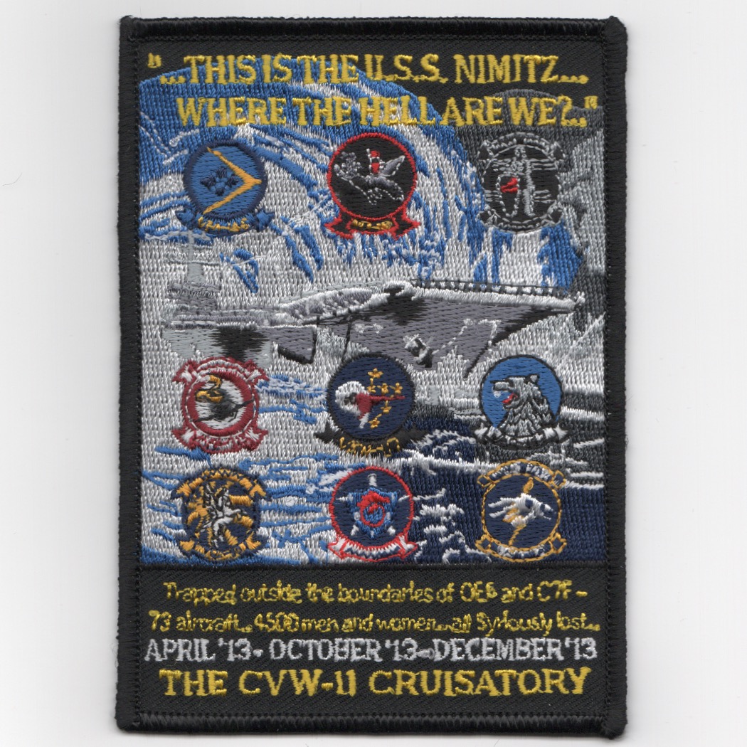 (Direct from the Squadron) This is the 2013 cruise patch created by the VAW-117 Wallbangers for their WestPac cruise onboard the USS Nimitz (CVN-68). It lists the dates of the cruise at the bottom as APRIL 13 – OCTOBER 13 – DECEMBER 13 and says “”””THE CVW-11 CRUISATORY””””. This patch does not have velcro attached.