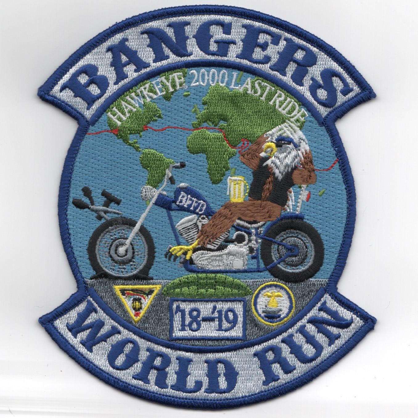 (Another AV8RSTUFF Creation): This is one of the 2018-2019 deployment patches created for the VAW-117 ‘WALLBANGERS’ for their “WORLD TOUR” onboard the USS STENNIS (CVN-74). It says “HAWKEYE 2000 LAST RIDE” (top) and shows their mascot (Hawkeye) sitting on a Harley Motorcycle with the letters “BFFD” on the gas tank!! There is a pair of scissors and hammer above the left (front) wheel, not sure why they wanted this, but must have an inside story I never got…..this patch does not have velcro attached.