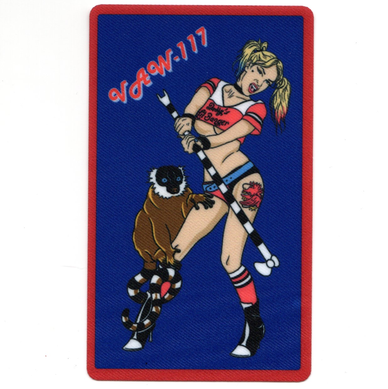 (Another AV8RSTUFF Creation): This patch was created by one of the officers at the end of his squadron tour, to be given to those he served with. It shows the scantily-clad female in a tight, short shirt that says “DADDYs LIL BANGERS” (their callsign) with the squadron logo tattooed on her left thigh. She’s holding a tailhook and has the squadron mascot, the LEMUR, climbing her right thigh. VERY. COOL. Patch….This patch is sublimated and does NOT have velcro attached.