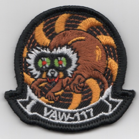 This is the VERY SMALL ‘LEMUR’ mascot version of the squadron patch for the VAW-117 “Wallbangers” that fly the E-2C out of NAS Miramar, CA. They were established in July 1974 and participated in the Persian Gulf operations in mid-1991. I believe this is an “inside joke” just for the squadron “new guys”, making them wear these until they earn their squadron colors……It does not come with velcro already attached.