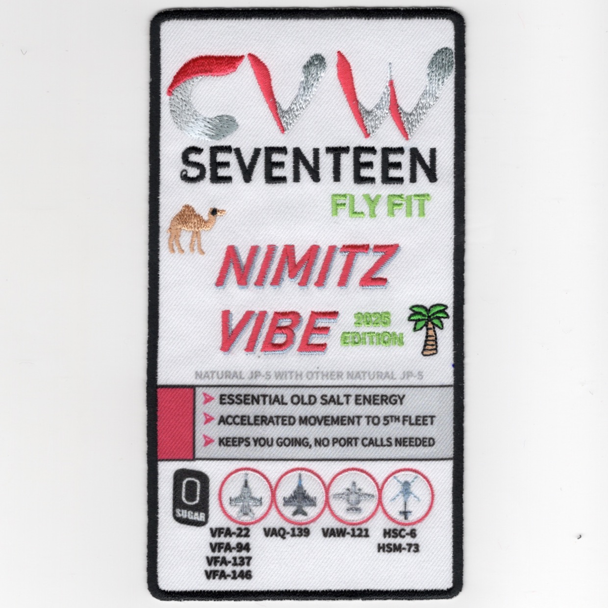 Carrier Airborne Early Warning Squadron 121 (VAW-121), also known as the “Bluetails”, is an Airborne Early Warning (AEW) and Command and control (CC) squadron operating the E-2D Hawkeye based at NAS Norfolk, VA. (CAO SPRING 2016) Currently a part of Carrier Air Wing 11 (CVW-11), the Bluetails deploy aboard the USS Nimitz (CVN-68). This is one of their 2025 cruise patches that says “NIMITZ VIBE” and shows the different aircraft of the Airwing and does not come with velcro attached.