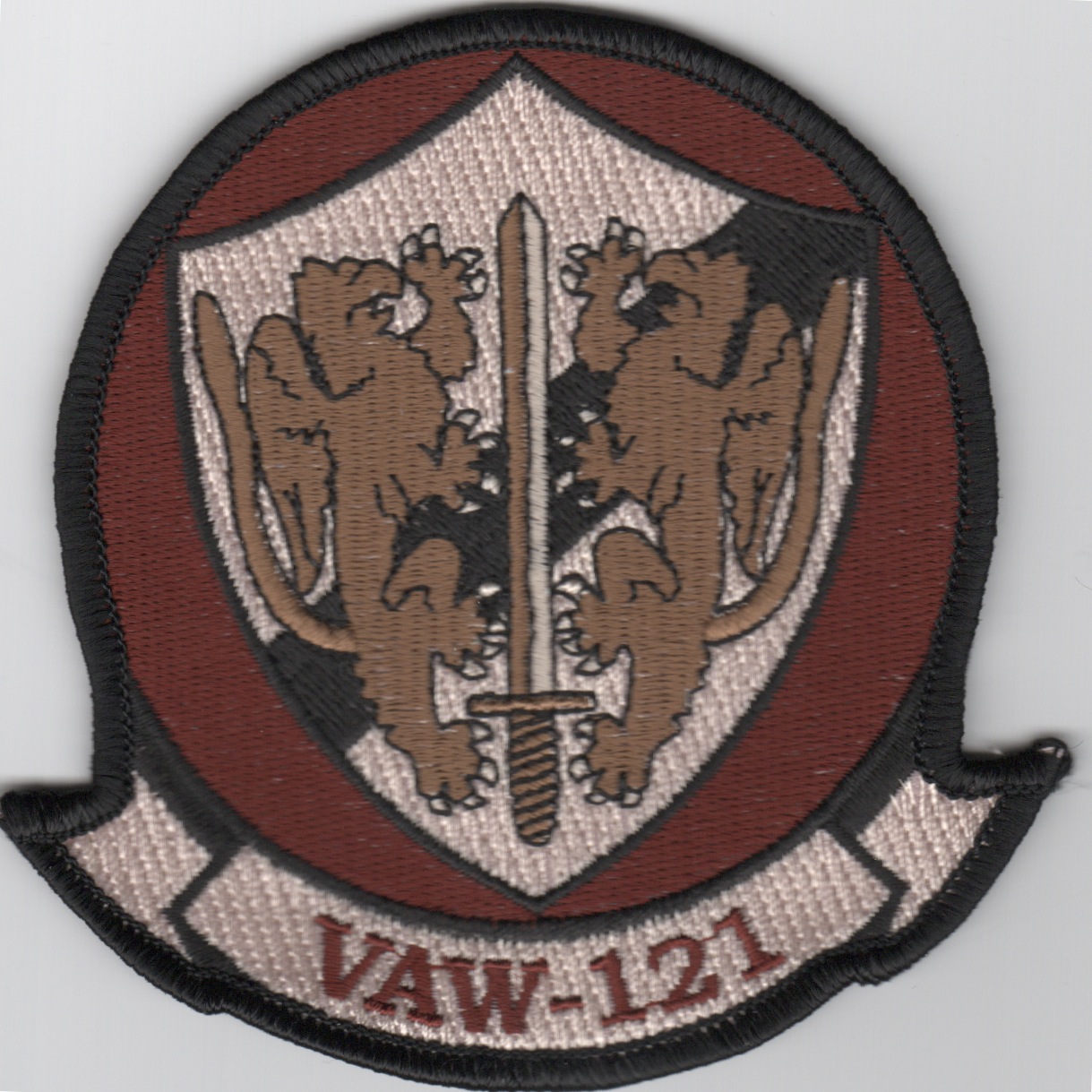 Carrier Airborne Early Warning Squadron 121 (VAW-121), also known as the “Bluetails”, is an Airborne Early Warning (AEW) and Command and control (CC) squadron operating the E-2D Hawkeye based at NAS Norfolk. Currently (SPRING 2016) a part of Carrier Air Wing 11, the Bluetails deploy aboard the USSÊNimitz. This is the desert version of their squadron patch.