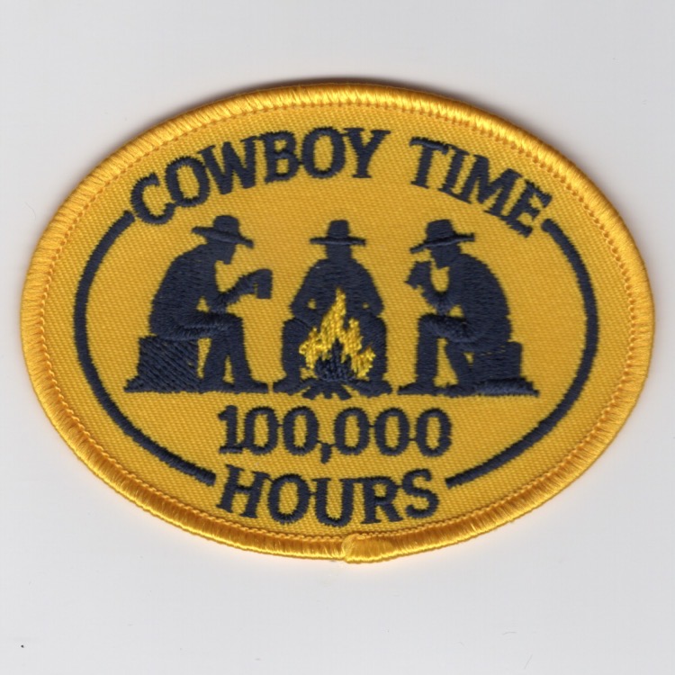 (Another AV8RSTUFF Creation): This is the yellow version of the VAW *COWBOY TIME* oval that says 100,000 HOURS and does not come with velcro attached.