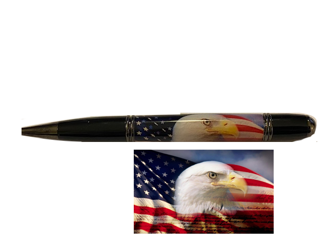 This is the customized *AMERICAN EAGLE on AMERICAN FLAG* PEN handcrafted by a local veteran. These are created when ordered, so it will take a few weeks to deliver. Beautiful works of art!!
