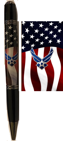 This is the customized *USAF LOGO on American Flag Background* PEN handcrafted by a local veteran. These are created when ordered, so it will take a 2-3 weeks to deliver. Beautiful works of art!!