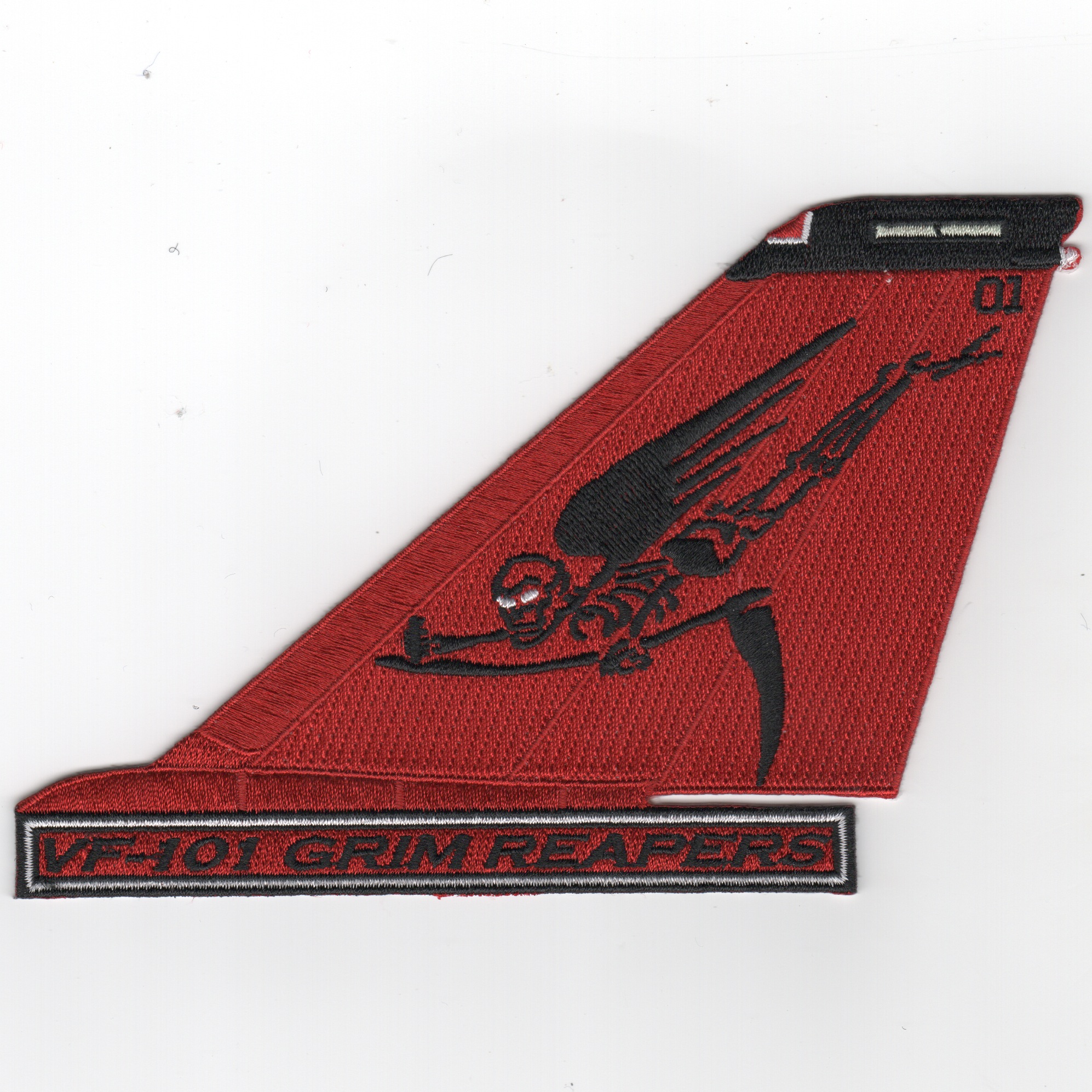 This is the “”””all-red”””” paintscheme for the F-14 Tomcat Tail Fin for VF-101 “”””Grim Reapers””””. This version has “”””Flying Moe”””” on it and does have TEXT at the bottom.