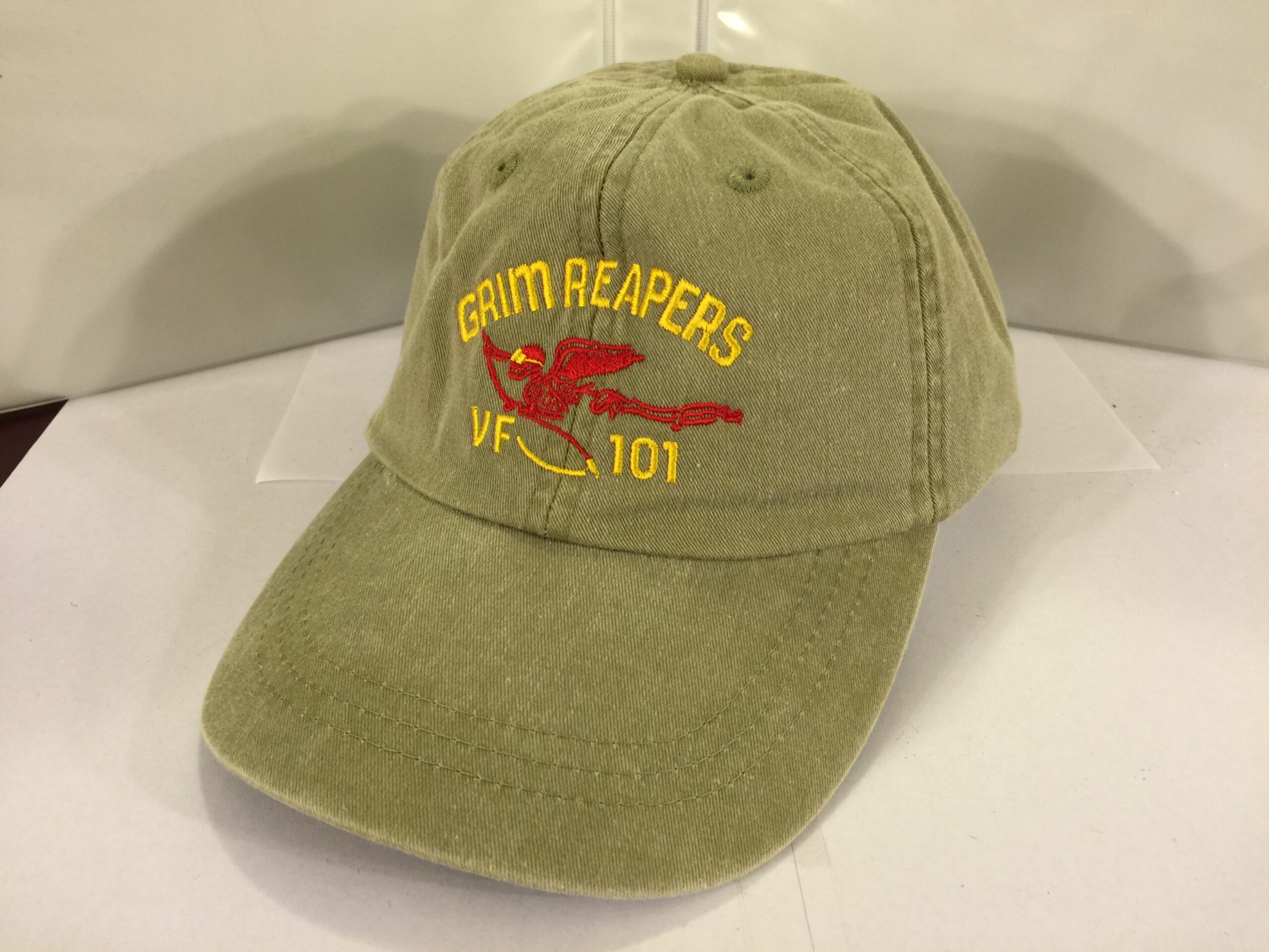 This is the “unofficial” form-fitting khaki ballcap with the red “Grim Reaper” (better known as “MOE” embroidered directly onto the front of the cap for the VF-101 crews stationed at NAS Oceana, VA that were the East Coast F-14 training squadron.