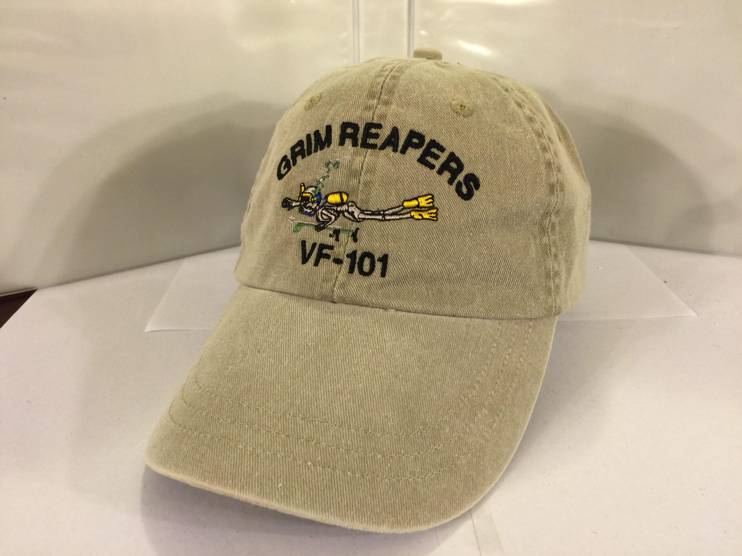 This is the “unofficial” form-fitting khaki ballcap with the SCUBA Grim Reaper embroidered directly onto the front of the cap for the VF-101 crews stationed at NAS Oceana, VA that were the East Coast F-14 Tomcat training squadron that go to Key West, FL for flight training.