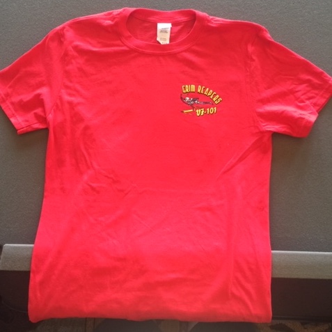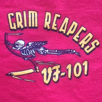 This is the full frontal veiw of the red version of the VF-101′ Grim Reapers’ squadron T-shirt. They were the F-14 Tomcat ‘RAG’ (Replacement Air Group) that trained Pilots/RIOs how to employ the venerable Tomcat. They have since transitioned to the VFA-101 role and train aviators in the F-35C. The back of the shirt is seen below. NO XL’s left!!