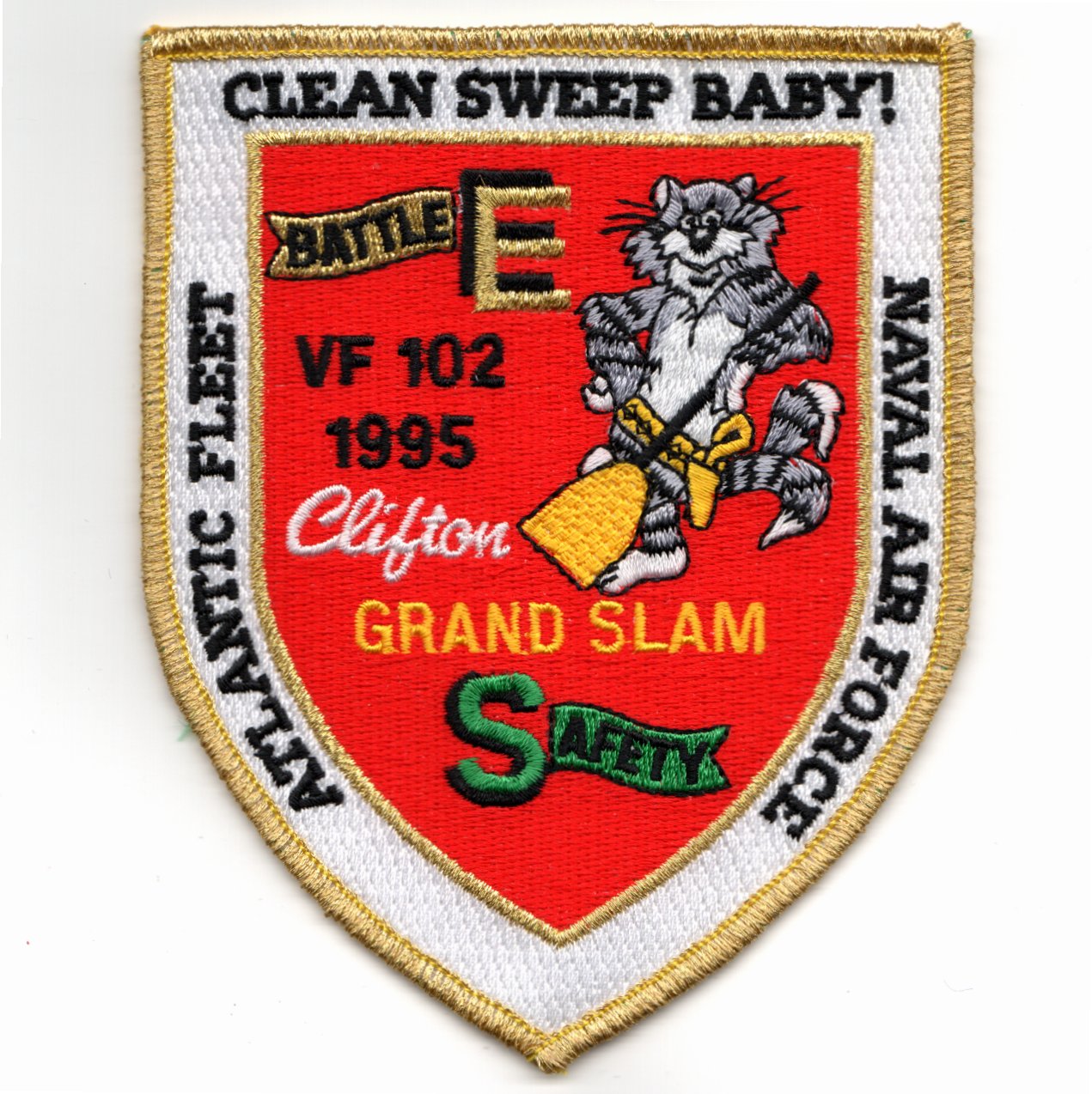 The VF-102 “Diamondbacks” are located at NAS Oceana, VA and flew the F-14A Tomcat. This is the “shield-shaped” patch of their 1995 Clifton Grand Slam patch created when they won the coveted Battle ‘E’, Safety ‘S’, and the CLIFTON awards at the same time (ie, GRAND SLAM). This patch does not have velcro attached.