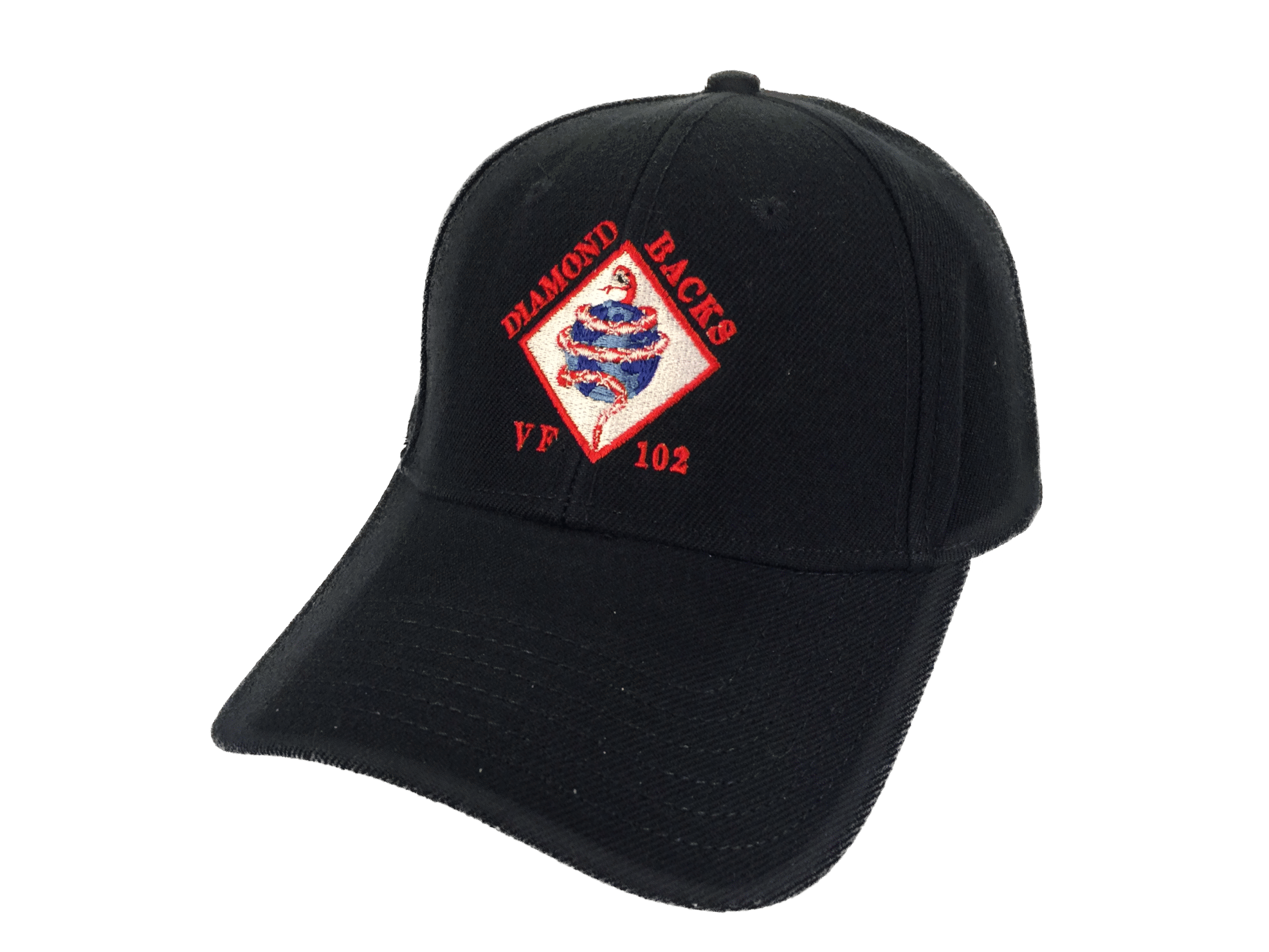 These were the official ballcaps worn by all the members of VF-102 Diamondbacks stationed at NAS Oceana, VA. The squadron logo is embroidered directly onto the front of the cap and this one has red lettering.