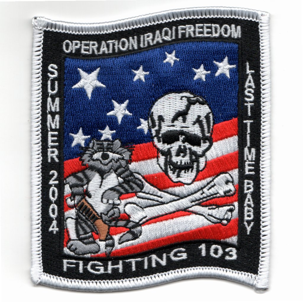 VF-103 was established in May 1952 and began the transition from F-4S Phantoms to the F-14A Tomcat in January 1983. The ‘Sluggers’ were with the USS Saratoga in CVW-17 for the majority of her time, before switching to the USS Enterprise. VF-103 adopted the “Skull and Crossbones” of VF-84 to continue their tradition. They have since transitioned to the F/A-18 Hornet when they returned from this, their LAST 2004 OIF TOMCAT cruise.This is the “blue” version of their commemorative patch for that last “summer Med” 2004 cruise. This patch does not come with velcro attached.