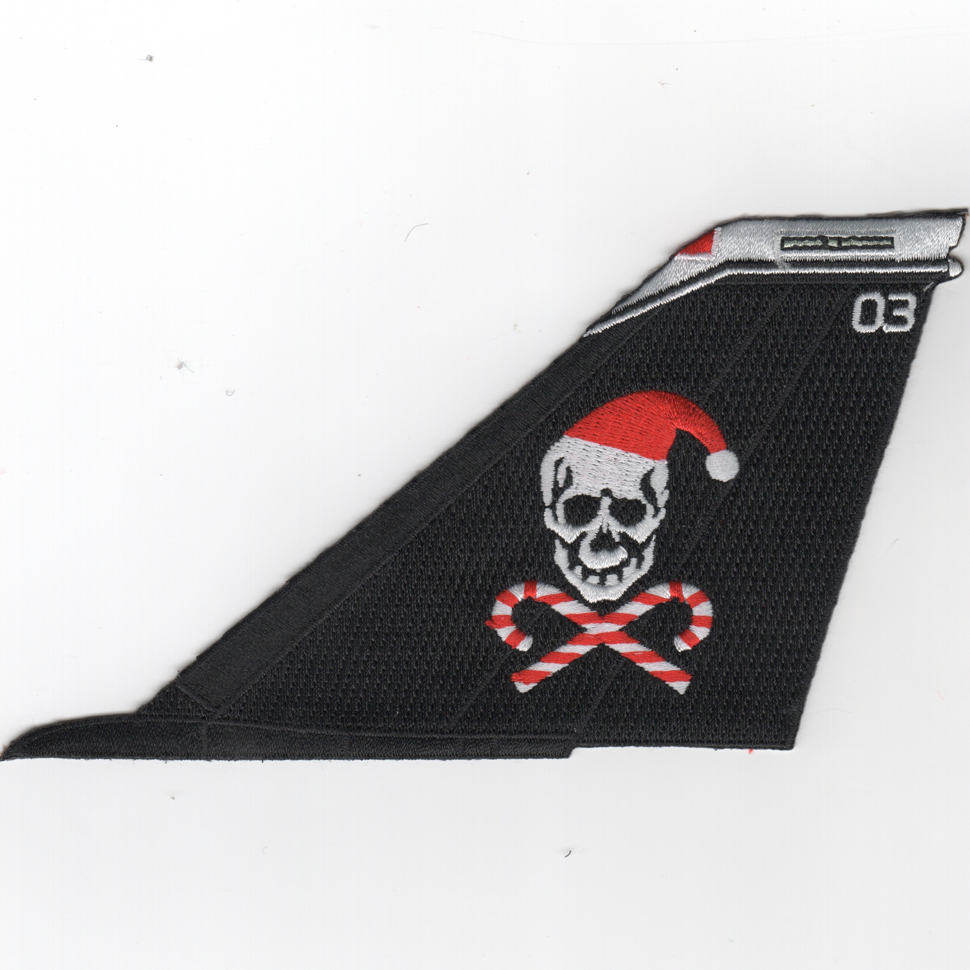 This is the ‘black/no text at bottom’ version of the Christmas tailfin created for the ‘Jolly Rogers’ for their cruise in 1996 onboard the USS Enterprise. It has since been used for other cruises also, but that was their first time. This patch does not come with velcro already attached.