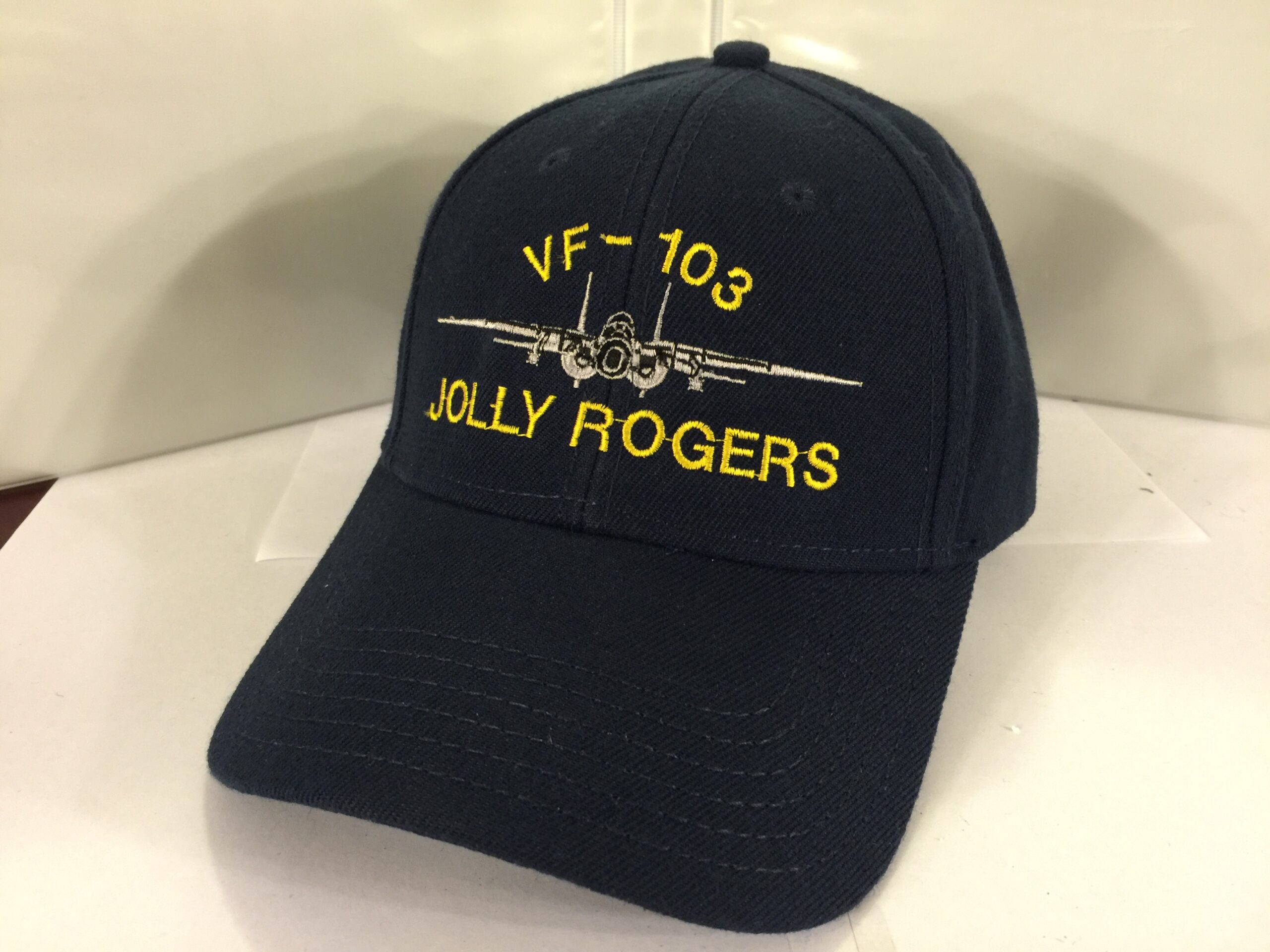 This is the navy wool version with the plastic adjustable strap in the back that has the VF-103 Jolly Rogers squadron name and frontal view of the F-14 Tomcat directly embroidered onto the front of the cap.