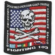 VF-103 was established in May 1952 and began the transition from F-4S Phantoms to the F-14A Tomcat in January 1983. The ‘Sluggers’ were with the USS Saratoga in CVW-17 for the majority of her time, before switching to the USS Enterprise. VF-103 adopted the “Skull and Crossbones” of VF-84 to continue their tradition. This patch was created for their 2002 Med/Persian Gulf Cruise for OEF and OSW.