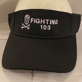 This is the black version of the *VISOR* worn by the members of VF-103 Jolly Rogers when they were stationed at NAS Oceana, VA. The squadron logo is directly embroidered onto the front of the visor and has “FIGHTING 103” also stitched on the front in white lettering.