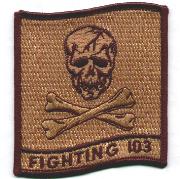 VF-103 was established in May 1952 and began the transition from F-4S Phantoms to the F-14A Tomcat in January 1983. The ‘Sluggers’ were with the USS Saratoga in CVW-17 for the majority of her time, before switching to the USS Enterprise. VF-103 adopted the “Skull and Crossbones” of VF-84 to continue their tradition. VF-103 had one of their TARPS-birds shot down by an optical SA-2 derivative in Desert Storm with the pilot being rescued and the RIO becoming a POW. This was the desert version of their squadron patch.
