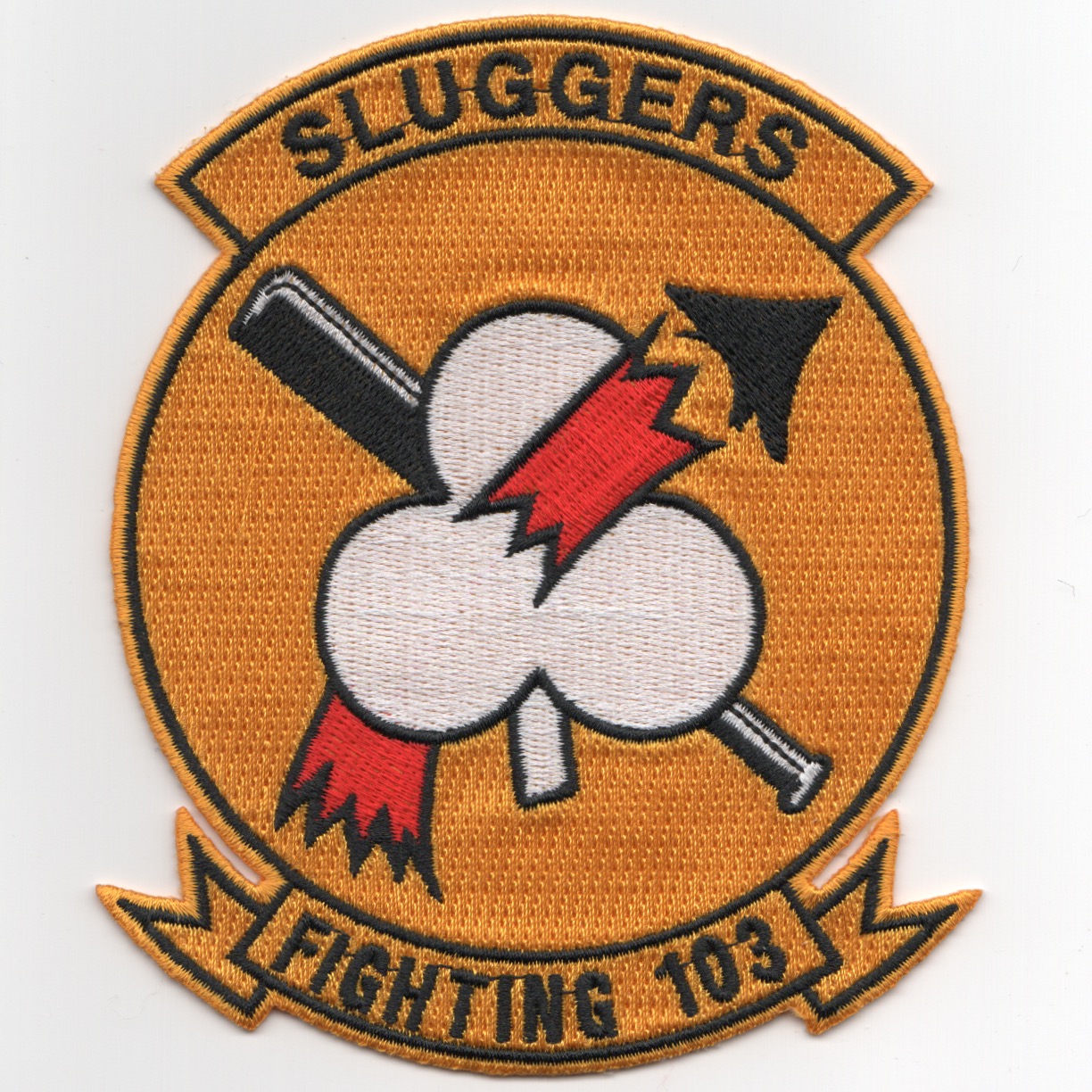 VF-103 was established in May 1952 and began the transition from F-4S Phantoms to the F-14A Tomcat in January 1983. The ‘Sluggers’ were with the USS Saratoga in CVW-17 for the majority of her time, before switching to the USS Enterprise. VF-103 adopted the “Skull and Crossbones” of VF-84 to continue their tradition. VF-103 had one of their TARPS- birds shot down by an optical SA-2 derivative in Desert Storm with the pilot being rescued and the RIO becoming a POW. This is the yellow, historical version of their squadron patch and does not come with velcro attached.