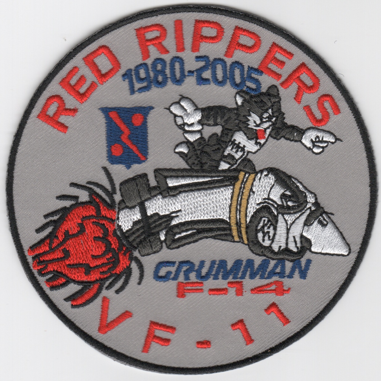 This is the round gray version of the 25th Anniversary/Decommission patch for the VF-11 Red Rippers. It shows the dates of their existance from 1980-2005 and does not come with velcro attached.