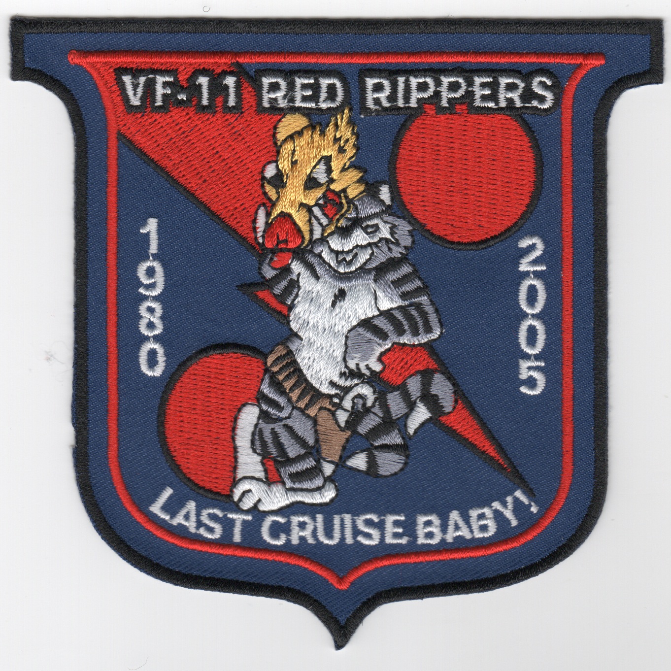 This is another “”””LAST”””” Tomcat cruise patch created for the VF-11 “”””Red Rippers”””” for their 2005 Cruise. It shows the years of their Tomcat existence from 1980 – 2005. Another must have “”””Last Cruise”””” patch. This patch does not come with velcro attached.