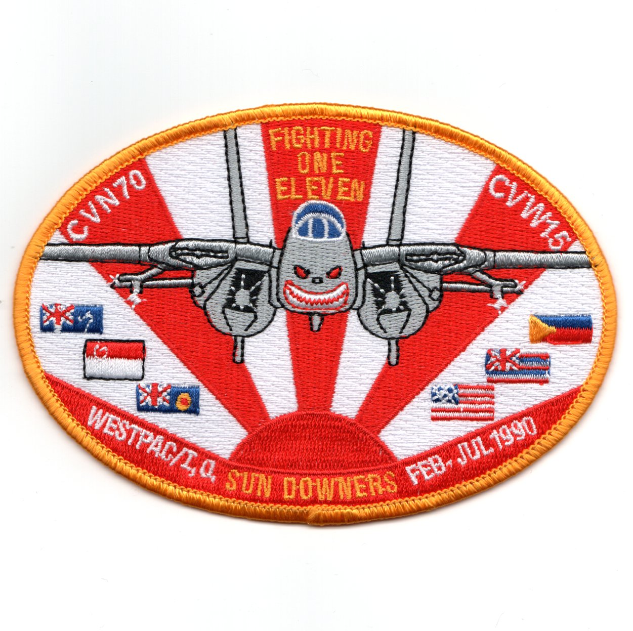 (Korean Shop): One of the squadron’s suppliers is a (no kidding) little ‘sweat-shop’ over in Korea, and on one of my recent visits there (for my real job), I came across this place and apparently he has an entire room full of stuff he had left over from years of doing patches for squadrons…..This is where I found this patch (very small quantities). This is the correct cruise patch made for the VF-111 ‘Sundowners’ that says ‘WESTPAC/I.O. SUNDOWNERS FEB-JUL 1990 across the bottom. It has the standard Japanese setting sun motif as well with the correct gray shade of the F-14 Tomcat. This patch does not have velcro attached.