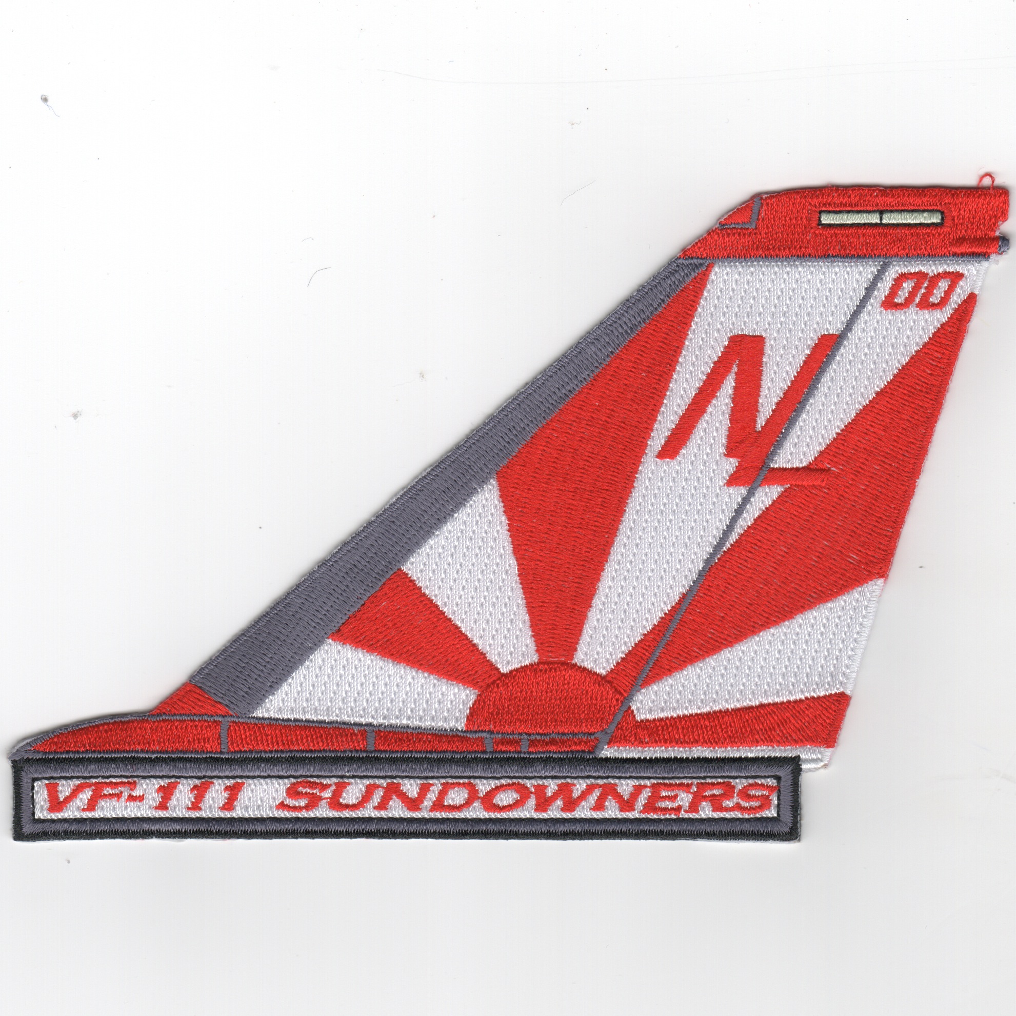 This is the ‘Red/White Setting Sun’ version of the Sundowners tailfin with the squadron desgination along the bottom. This patch does not come with velcro already attached.