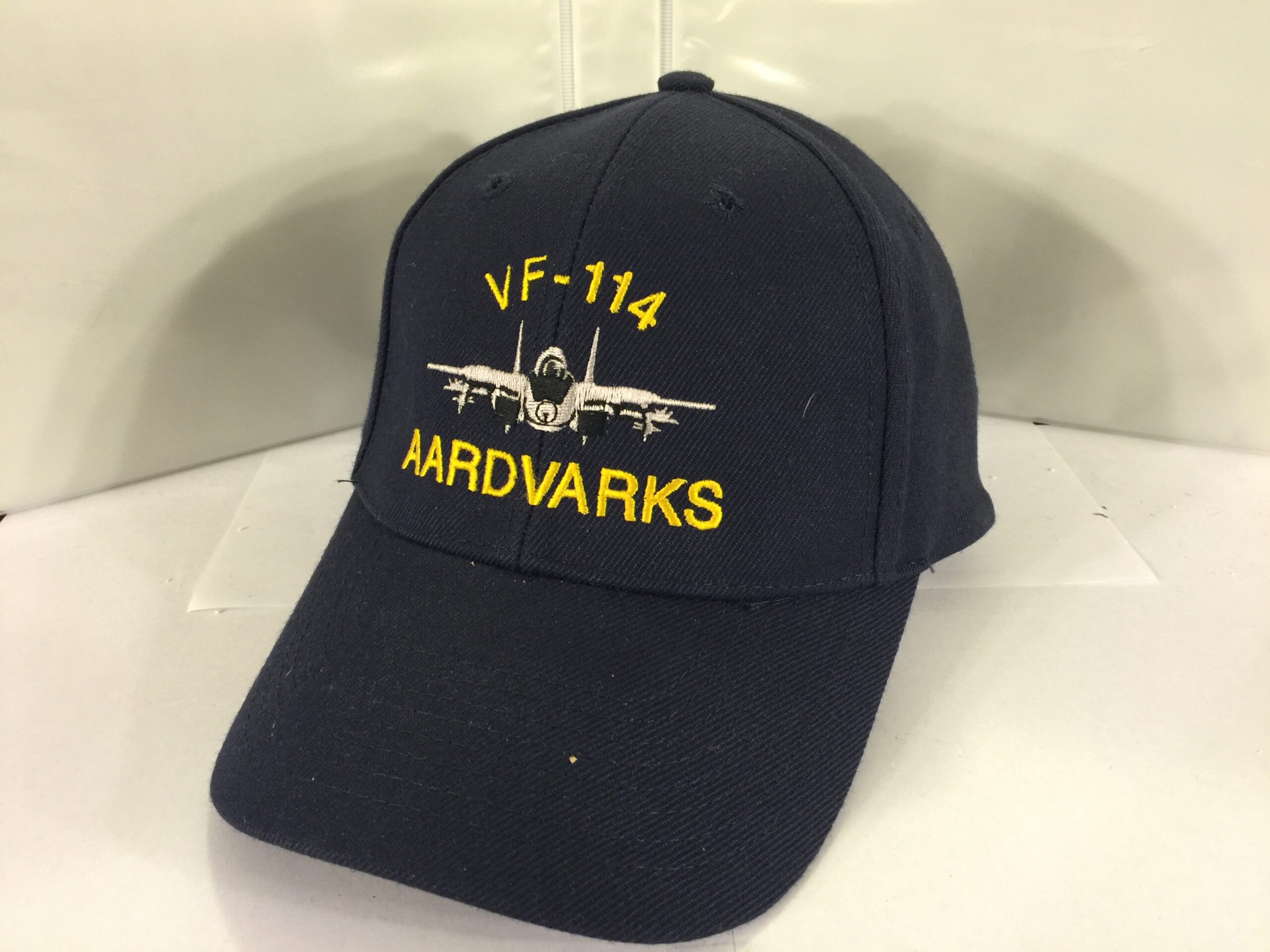 This is the navy wool version with the plastic adjustable strap in the back that has the VF-114 squadron name and frontal view of the F-14 Tomcat directly embroidered onto the front of the cap.