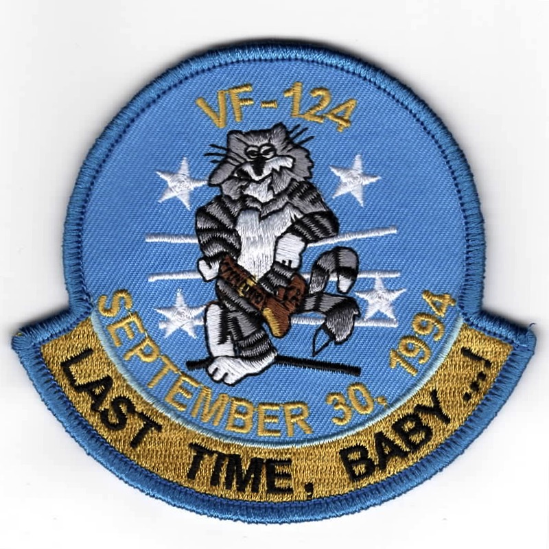 The ‘Gunfighters’ of VF-124 were established as VF-53 in August ’48, then redesignated to their current designation in April ’58. They were the West Coast RAG (Training Squadron) that trained the pilots and RIOs for the F-14 Tomcat. They were decommissioned when all the CONUS Tomcat squadrons were moved to the Master Jet Base NAS Oceana. This is there decommissioning patch with the date September 30, 1994 on it and says “Last Time, Baby…!”” across the bottom. This patch does not have velcro attached.