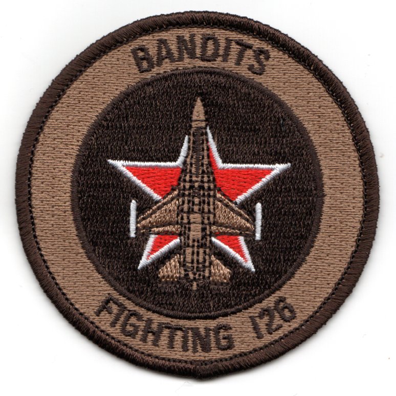 Fighter Squadron 126 (VF-126) was an aggressor squadron of the U.S. Navy. The squadron was originally established as Attack Squadron 126 (VA-126) on 6 April 1956, then was redesignated VF-126 on 15 October 1965 and disestablished on 1 April 1994. This is the desert, round version of their ‘bullet’ patch for their F-16 Falcon aircraft, and does not come with velcro attached.