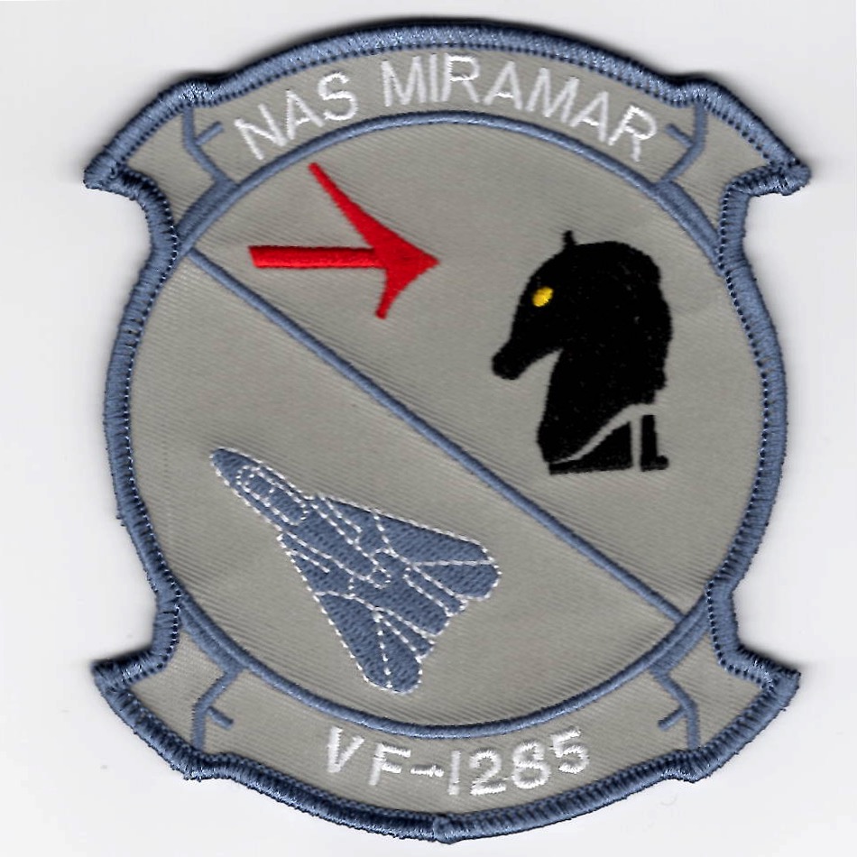 VF-1285 performed the same mission for the West Coast Fleet squadrons as VF-1486, and flew either VF-301 or VF-302 F-14 Tomcats. The Fighting Fubijars were disestablished just prior to VF-301/VF-302’s dis-establishment, and the three units (or what was left of them!) stood up as VF-1485 Americans. This is the blue/gray version of their squadron patch that says NAS MIRAMAR (top) and does not come with velcro attached.