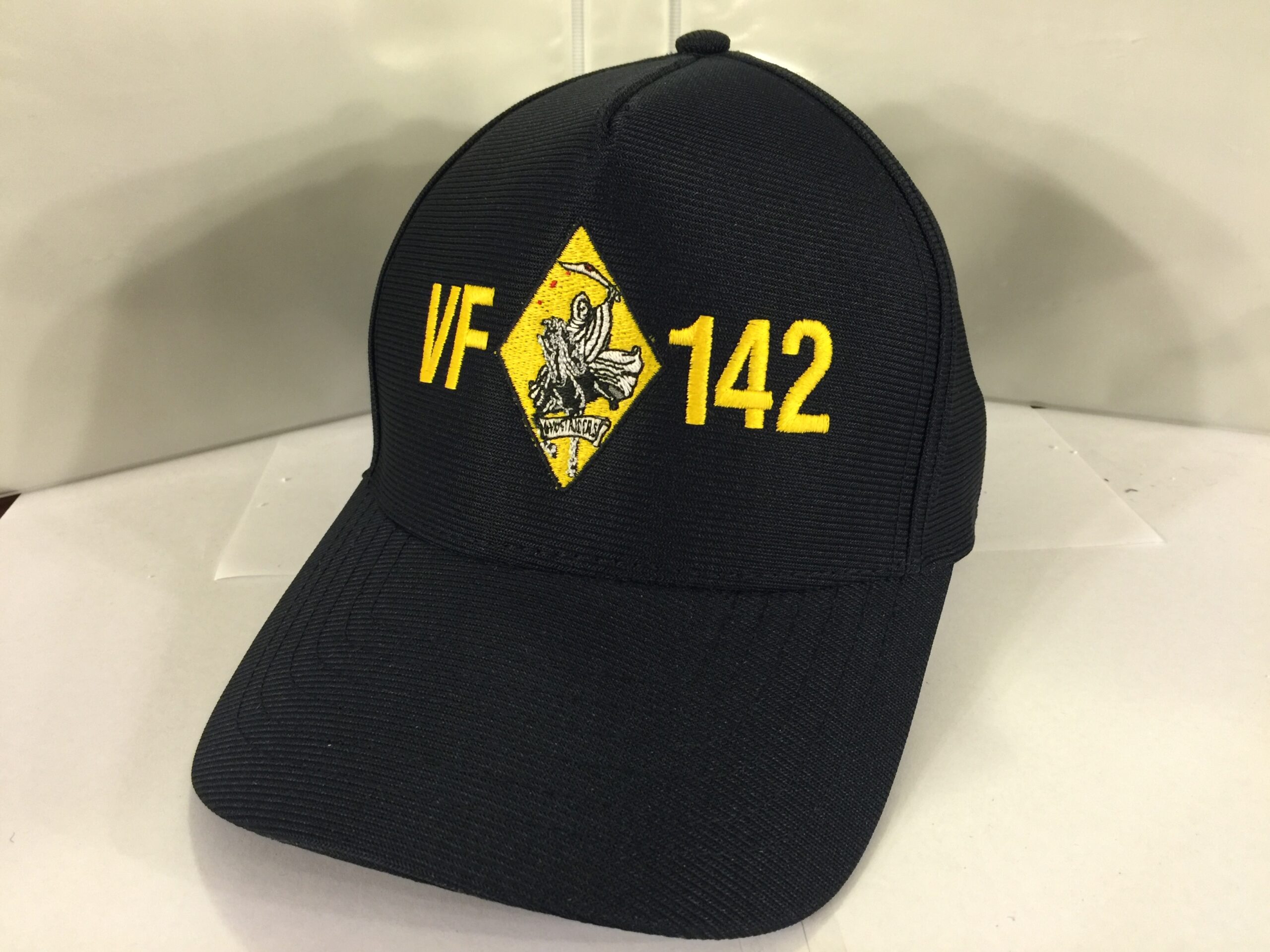 This is the navy wool version with the plastic adjustable strap in the back that has the VF-142 squadron name and squadron patch directly embroidered onto the front of the cap.