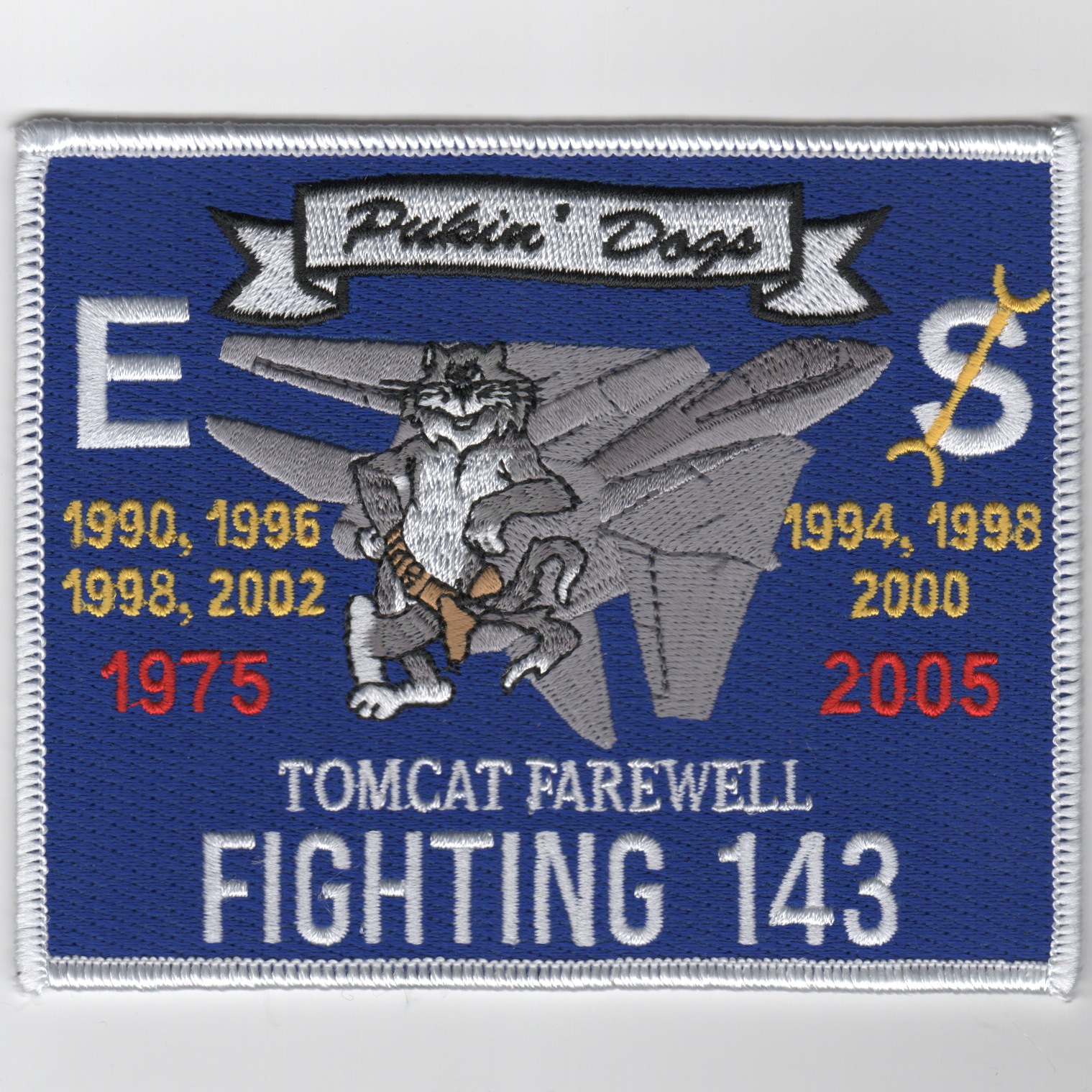The ‘Pukin Dogs’ of VF-143 flew the F-14Bs out of NAS Oceana, VA. They did their maiden F-14 voyage onboard the USS America in 1976. This is the large, white-bordered version of their “award” patch given to them for their excellence in 2005 with the Clifton Battle ‘E’ patch commemmorating their last Battle ‘E’ award as a Tomcat squadron. It also shows their history of Battle ‘E’s, 1990/1996/1998/2002 and their Safety ‘S’s from 1994/1998/2000/2005, and is their “Tomcat Farewell” patch created for their decommissioning. This patch does not come with velcro attached.