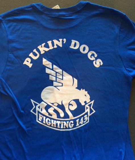 This is the full frontal veiw of the blue version of the VF-143 ‘Pukin Dogs’ squadron T-shirt. They flew the F-14 Tomcat (VF) and have since transitioned to the F/A-18 Hornet (VFA). Put the size you want in the COMMENTS section. There are only a few, so grab them while they last. The back-design of the shirt is seen below.