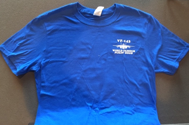 This is the full frontal veiw of the blue version of the VF-143 ‘Pukin Dogs’ squadron T-shirt. They flew the F-14 Tomcat (VF) and have since transitioned to the F/A-18 Hornet (VFA). Put the size you want in the COMMENTS section. There are only a few, so grab them while they last. The back-design of the shirt is seen below.