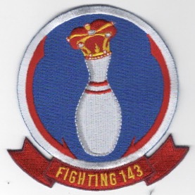 The ‘Pukin Dogs’ of VF-143 began existance as VF-871, a Reserve squadron activated for the Korean War in July 1950. They flew F-4J Phantoms until 1974 when they transitioned to the F-14A Tomcat. They converted from Pacific to Atlantic fleet, homeporting at NAS Oceana, VA. They were attached to CVW-7/CVN-69 during Desert Storm and had VF-142 as their sister squadron aboard ship. They flew the F-14Bs for many years, then transitioned to the F/A-18 Hornet. This is their “historical” squadron patch that shows the “KING” (Great Britain) and the “Bowling Pin with the Crown” (meaning the KING PIN) and does not have velcro attached.