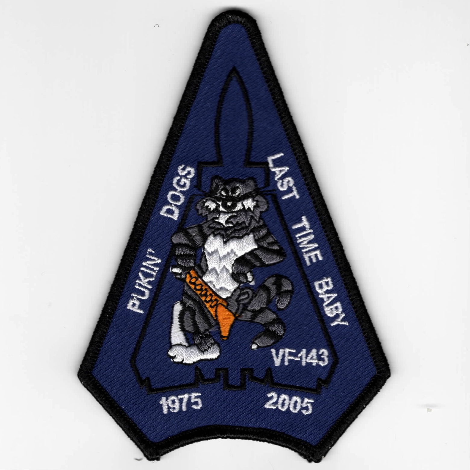The ‘Pukin Dogs’ of VF-143 began existance as VF-871, a Reserve squadron activated for the Korean War in July 1950. They flew F-4J Phantoms until 1974 when they transitioned to the F-14A Tomcat. They made their first Tomcat cruise aboard the USS America (CV-66) in April 1976, transitioning to the F/A-18 Hornet in 2005. This is their “Last Time, Baby” aircraft patch depicting the F-14 Tomcat Dates for their tenure, 1975-2005 and does not come with velcro attached.