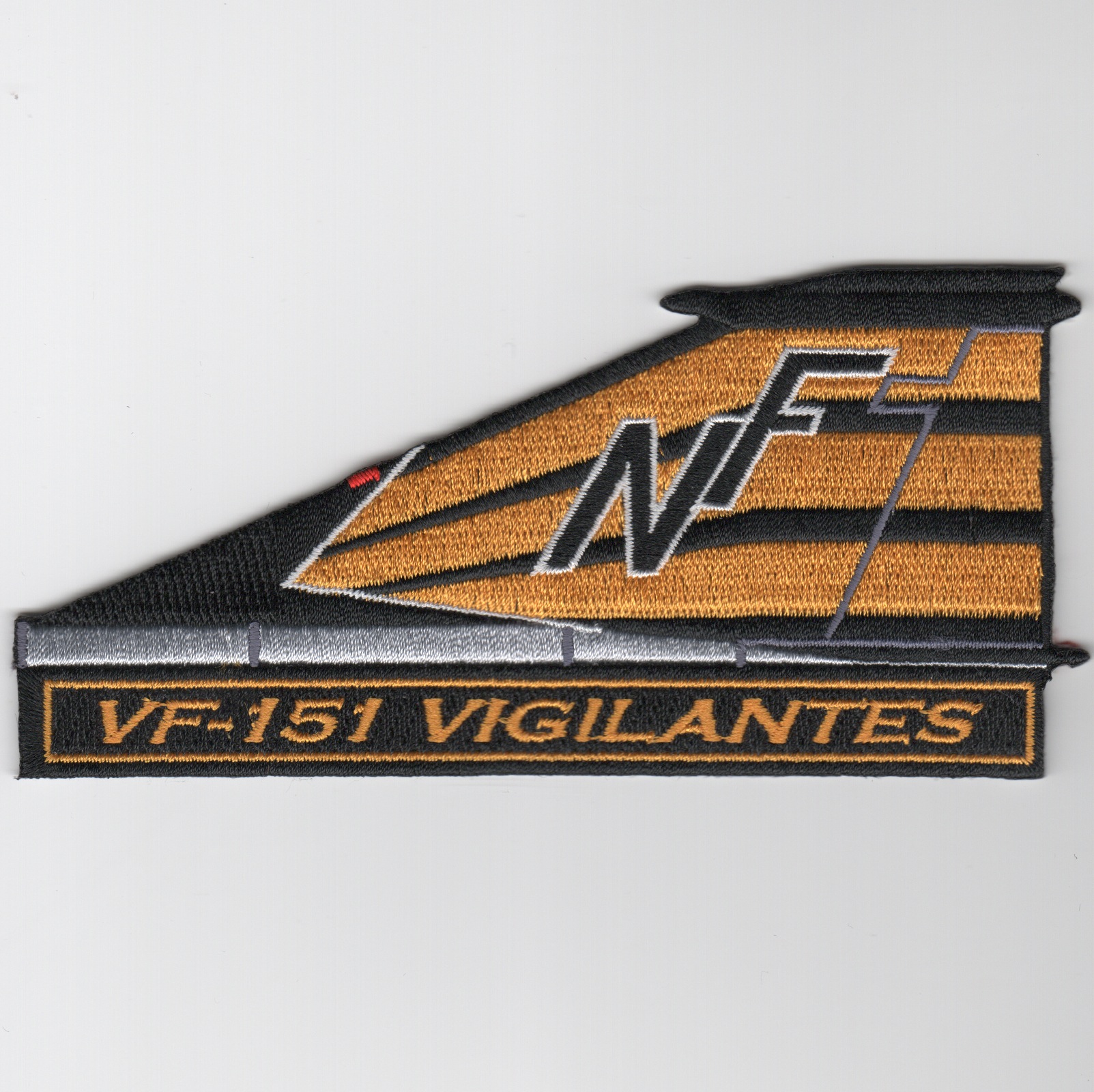 This is the yellow/black version of the TAILFIN patch for VF-151 when they flew the F-4 Phantom. In December of 1964, the Vigilantes transitioned to the McDonnell Douglas F-4B Phantom II, flew it for many years, then flew off the Midway for the last time on 24 March 1986. This marked the end of an era as this was also the last time the F-4 Phantom II was to operate from an aircraft carrier.