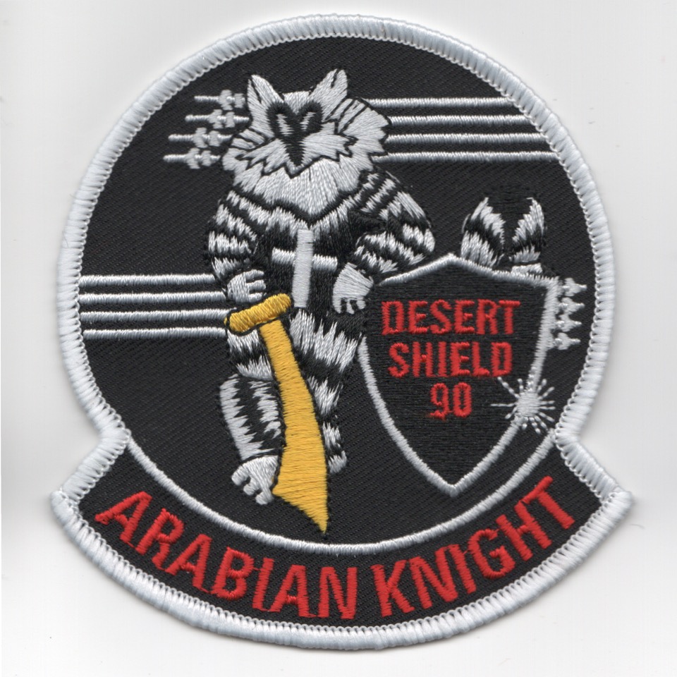 The VF-154 ‘Black Knights’ were established in February 1951, then designated as VF-154 in February 1953. They flew the F-4S Phantom before transitioning to the F-14A Tomcat. This is the black version of their Desert Storm Felix patch worn during their participation in the conflict. It shows Felix in his “Knight Templar” vest with the arabian sword at his side and the shield lists their “1990 DESERT SHIELD” participation. This patch does not come with velcro attached.
