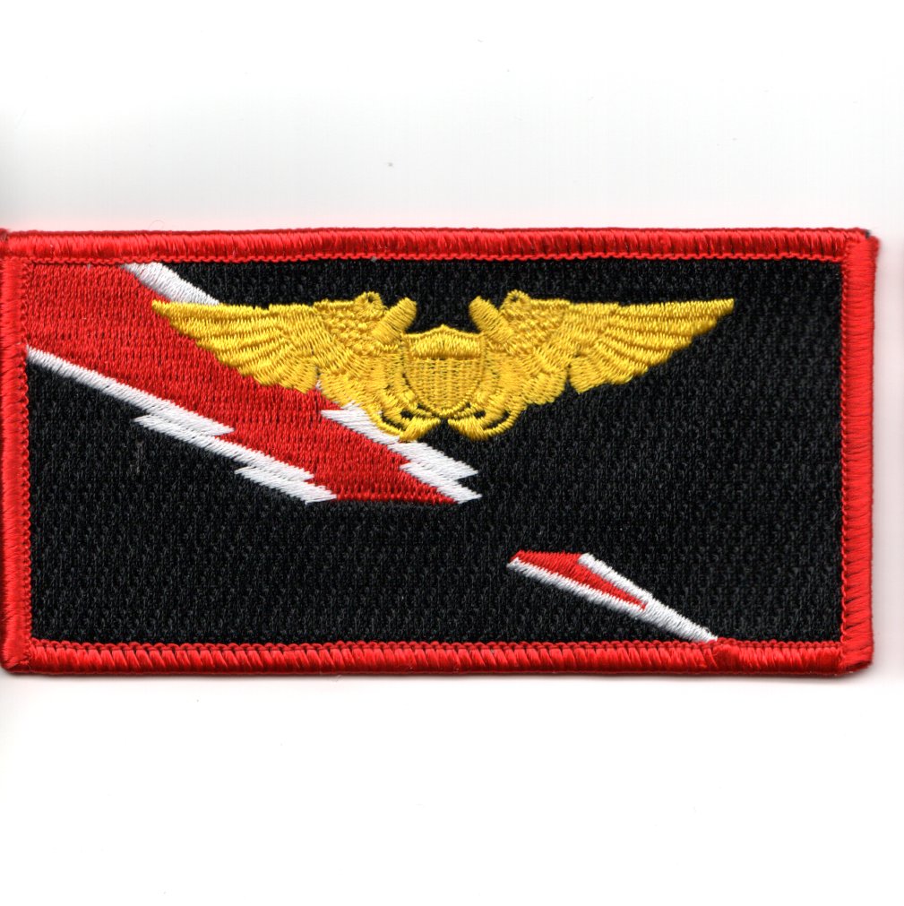 This is the black version of the RIO/WSO nametag for the VF-161 CHARGERS. It has the “”””break”””” in the lightning bolt so that you can get your name embroidered and does not come with velcro.