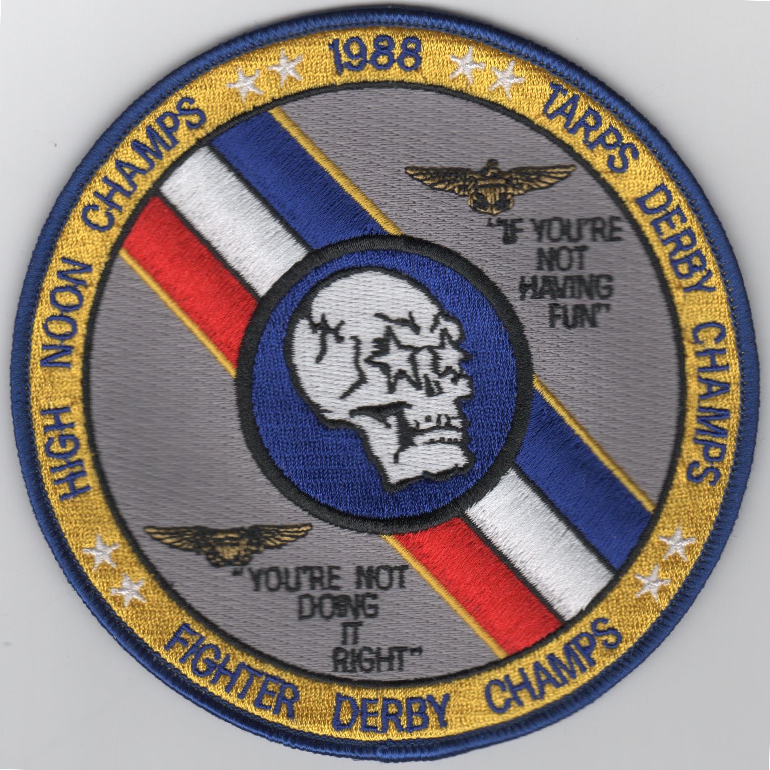 This is the large version of the patch created by VF-2 to commemorate their 1988 “High Noon Champs”, “TARPS Derby Champs”, and the “FIGHTER Derby Champs” victories. It says “If you’re not having fun, you’re not doing it right”. This patch does not come with velcro already attached.
