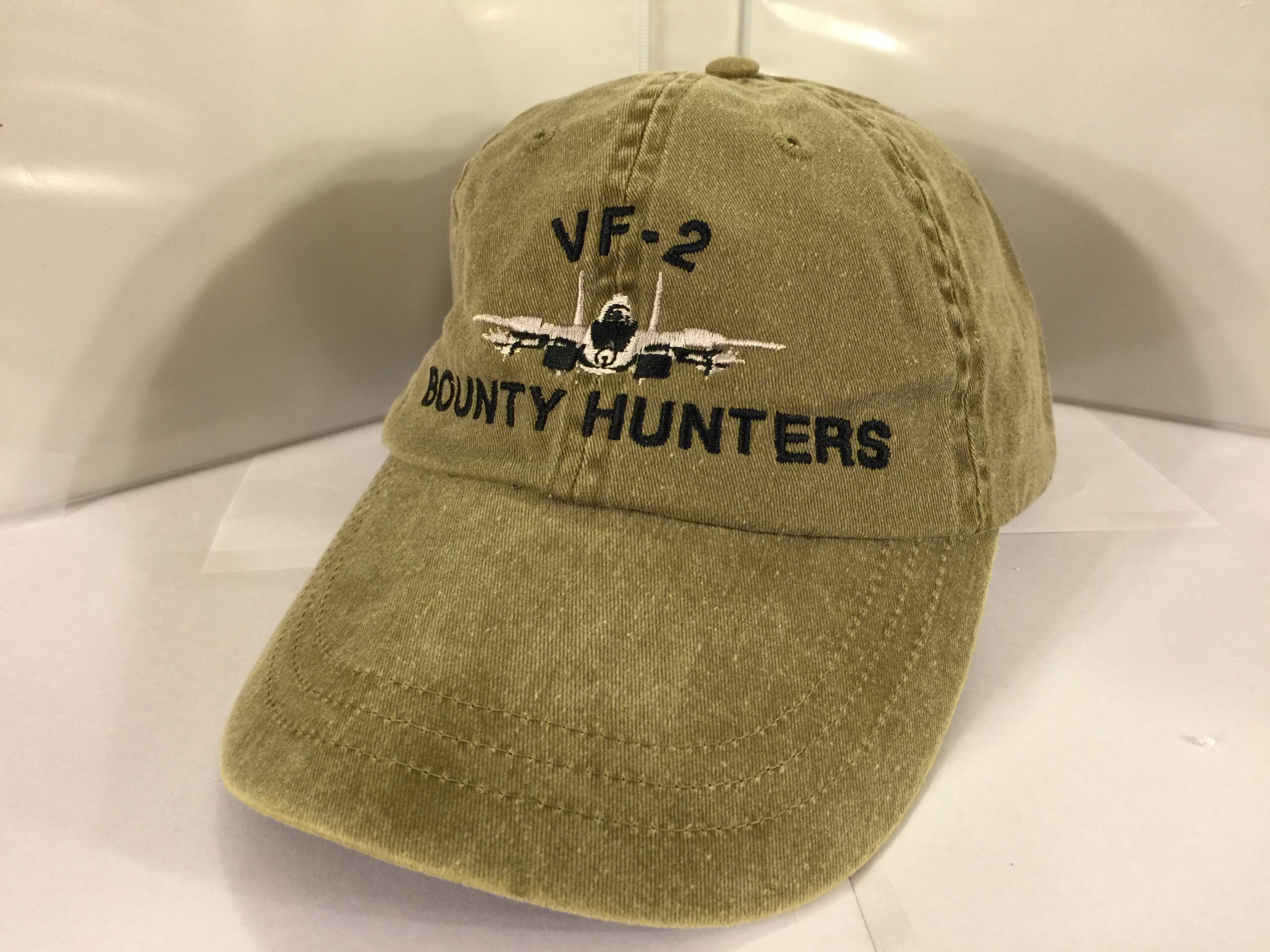 This is the khaki ballcap with the adjustable leather strap in the back that has the VF-2 squadron designator, “callsign” and frontal view of the F-14 Tomcat embroidered directly onto the front of the cap.