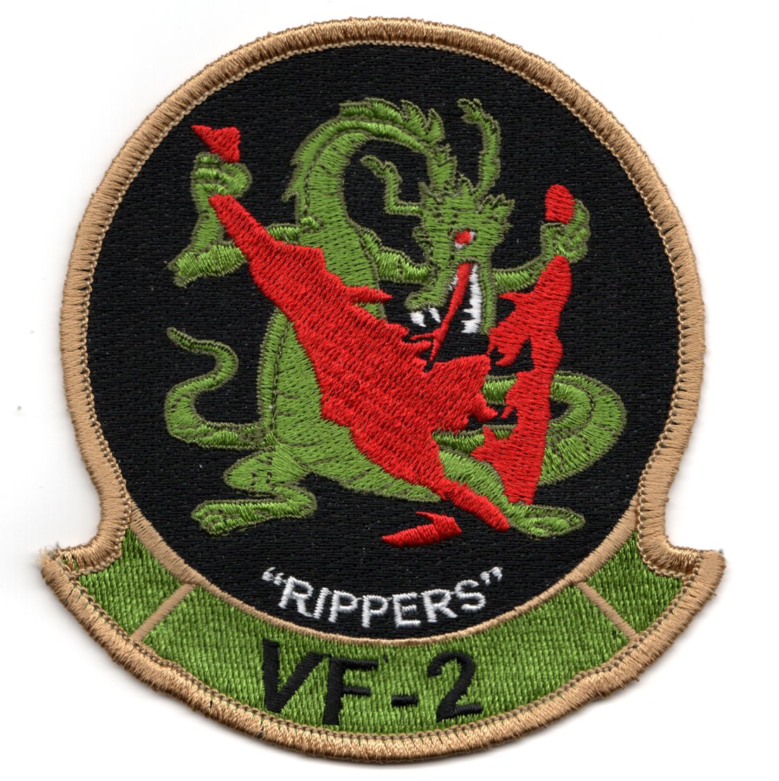 This is the RED(only)-flag version of the HISTORICAL “RIPPERS” squadron patch for VF-2. Fighter Squadron 2 or VF-2 was an aviation unit of the United States Navy. Established on 1 June 1943, it was disestablished on 9 November 1945. It was the third US Navy squadron to be designated as VF-2. This patch shows a dragon tearing up (RIPPING) a solid red flag. It was created as a “legacy” patch for the squadron and does not have velcro attached.