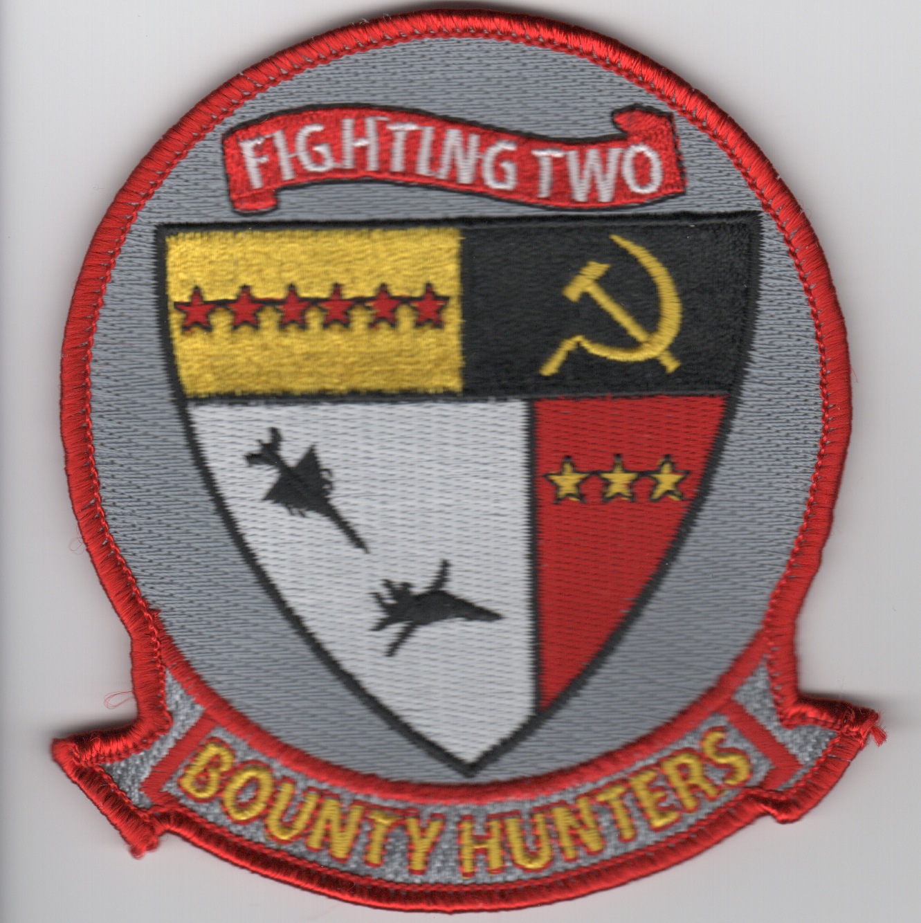 This is the “”””red-bordered”””” version of the squadron patch created for the Bounty Hunters that they wore when playing the role of “”””ADVERSARY”””” during different exercised/workups. You can also see the Russian “”””Sickle”””” on the shield in the upper left corner. This patch does not come with velcro attached..
