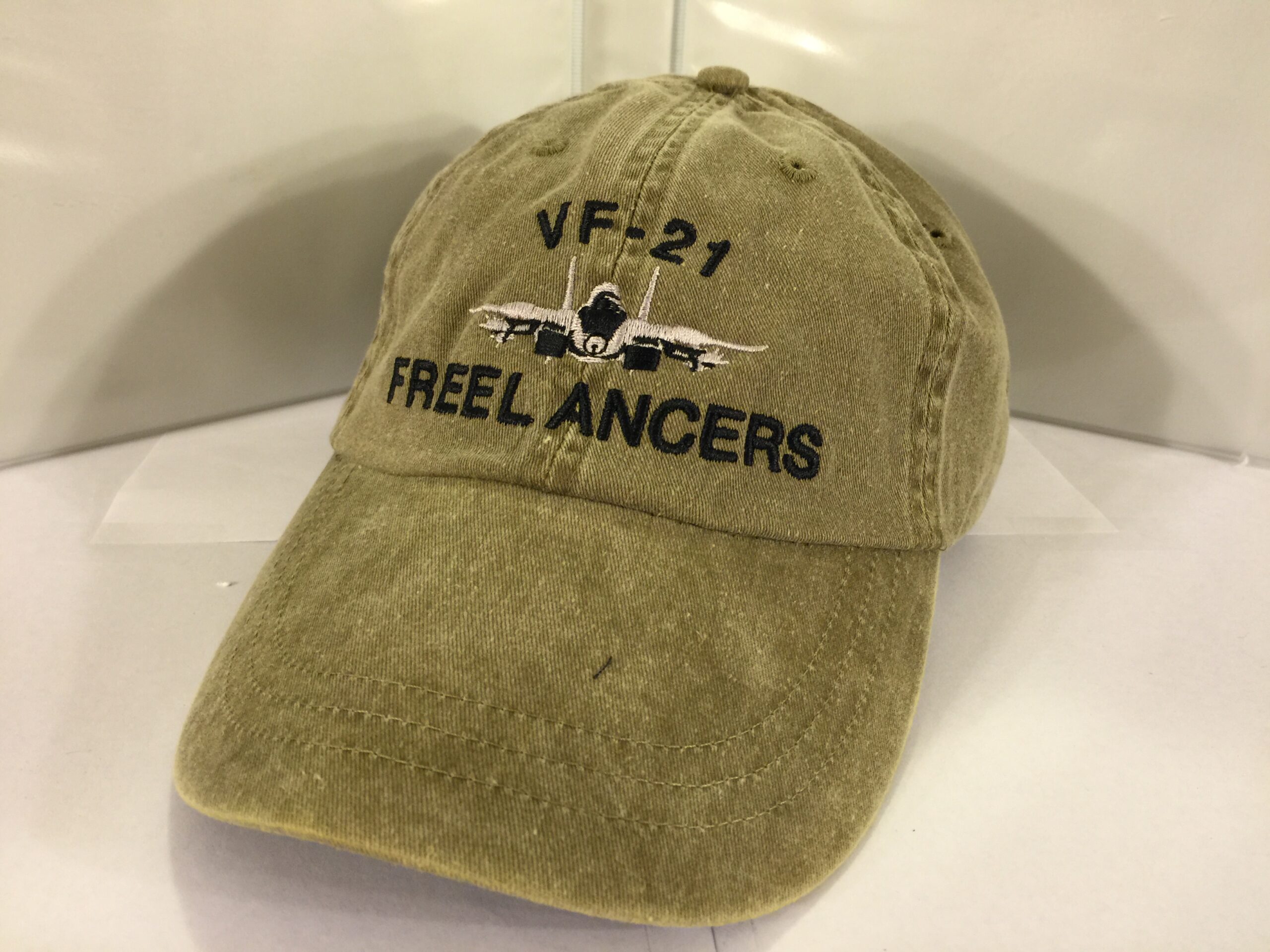This is the khaki ballcap with the adjustable leather strap in the back that has the VF-21 squadron designator, “callsign” and frontal view of the F-14 Tomcat embroidered directly onto the front of the cap.
